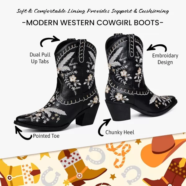 Uacllcau Cowboy Boots for Women Embroidered Floral Cowgirl Boots Low Chunky Heel Western Boots Wedding Bride Dress Ankle Booties…(Black)